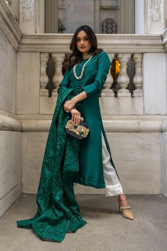 Enhancing a Pakistani churidar suit’s overall appearance with accessories that go perfectly can significantly elevate its visual impact. Here are a few suggestions: